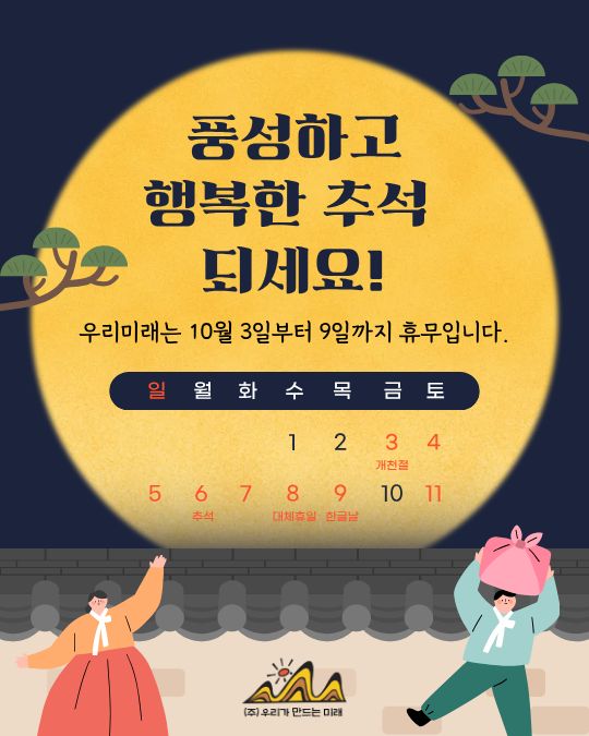 우리미래는 추석 연휴를 맞이하여 개천절인 10월 3일부터 9일까지 쉬어갑니다.