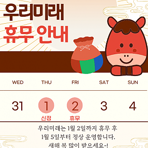 안녕하세요?우리미래입니다!한해를마무리하는시점,크리스마스의설렘과따뜻한마음이함께하는12월입니다.올한해도많은일들을함께해주신여러분께감사드리며,다가오는크리스마스와연말도행복과즐거움으로가득한시…